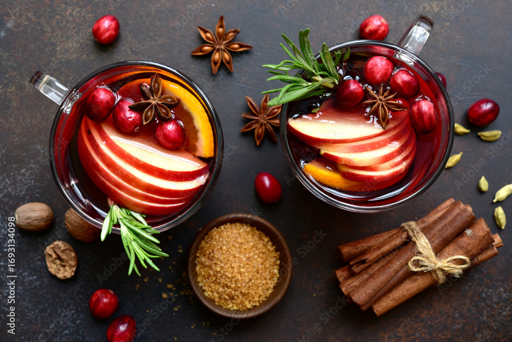Delicious mulled wine with ingredients for making. Top view with copy space.