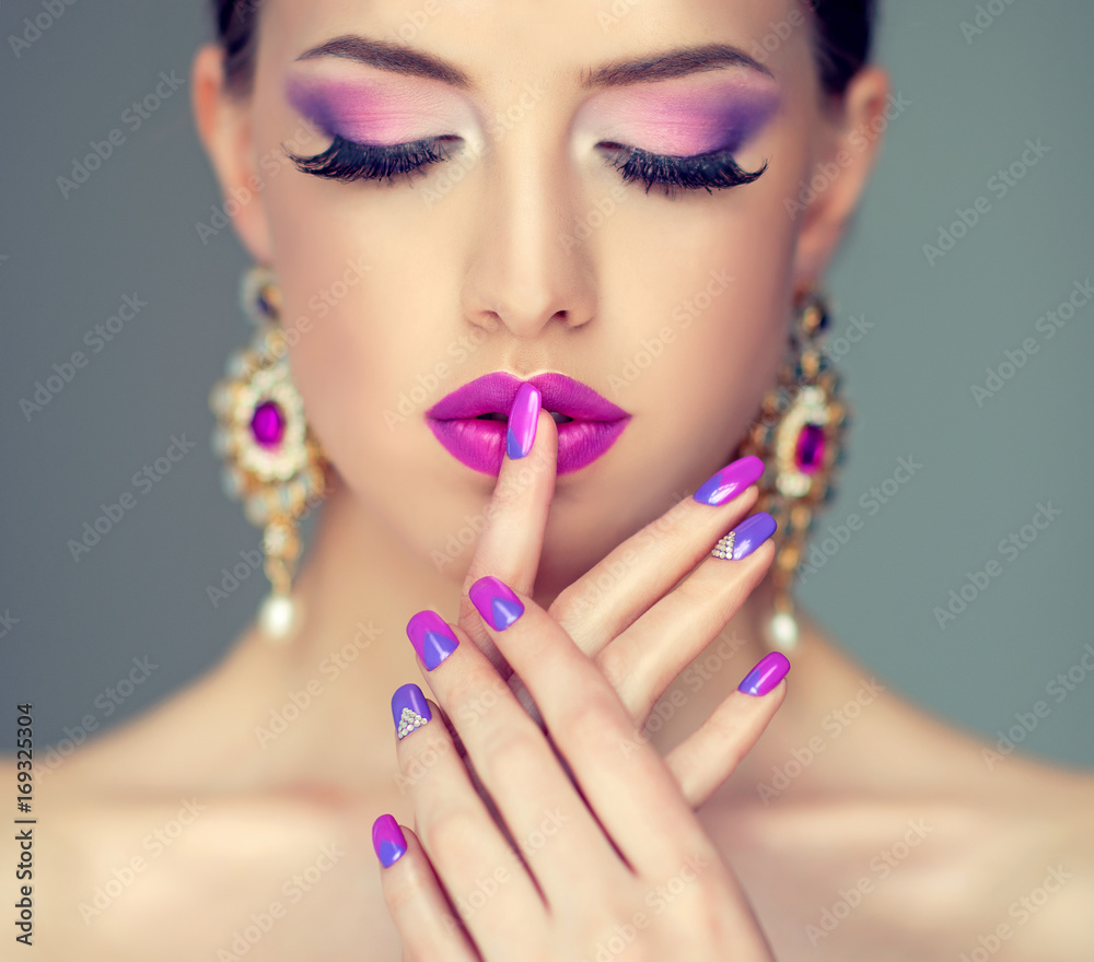 Beautiful girl model with fashion violet make-up and purple design manicure on nails . Jewelry and cosmetics , large violet earrings