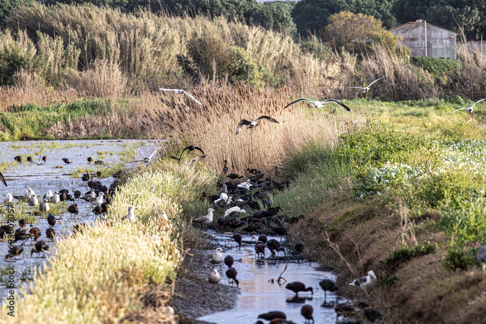 Glossy ibis, Plegadis falcinellus and seagulls at Porto Palafita da Carrasqueira in Portugal