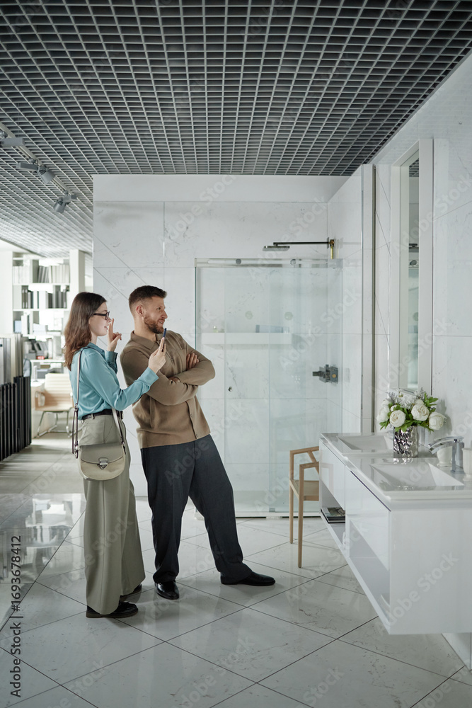 Caucasian young woman and man standing in modern bathroom showroom taking photo on smartphone