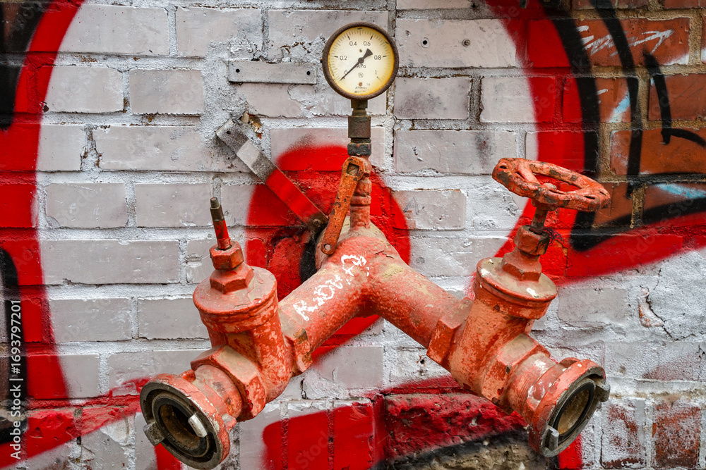 Red above-ground hydrant, a fitting for drawing water from a water distribution system and a pressure gauge on a whitewashed brick wall