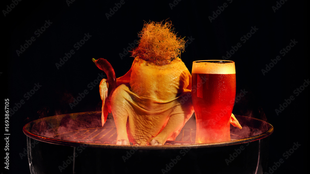 Chicken on grill with parsley bunch chili pepper and glass of beer in humorous scene. Concept of surreal barbecue art, lifestyle branding, culinary humor and creative design.