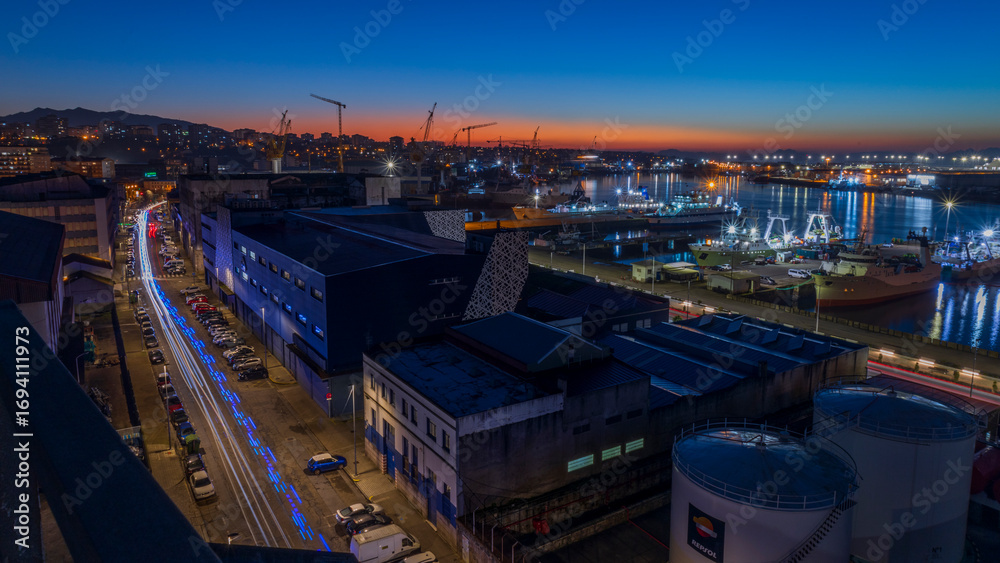 A Shipyard's Evening Glow in Vigo, Spain. Bright lights illuminate the shipyard, reflecting off the dark water. The scene captures the productive energy of the city at nightfall.