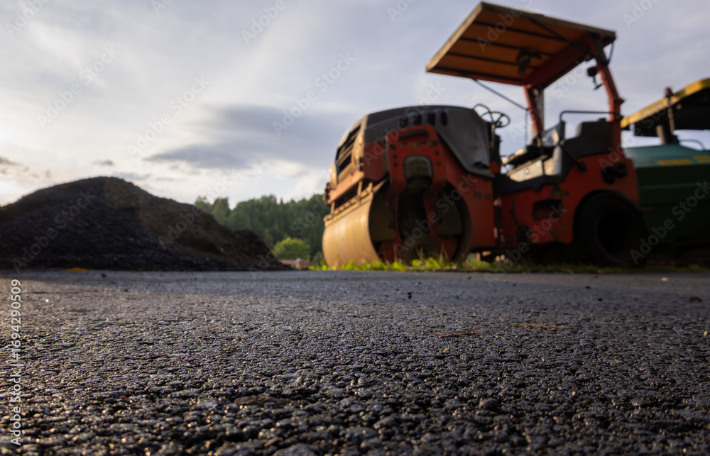 Newly laid asphalt on a road under renovation with a roller and asphalt laying machines in the background