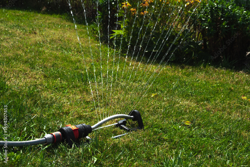 Garden irrigation system with sprinkler, providing water to garden plants during summer drought