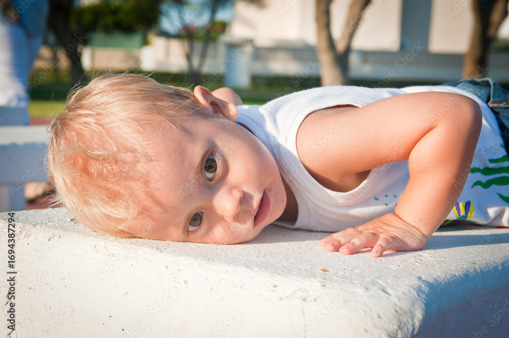 small boy lies on bench sad and thoughtful in autumn park in fresh air