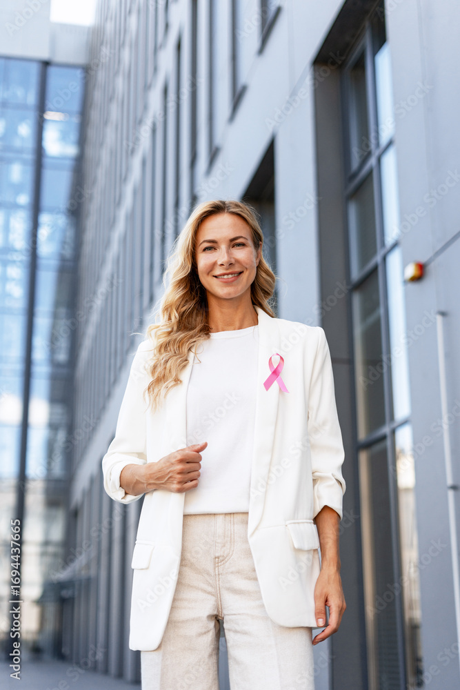 Smiling businesswoman wearing pink ribbon for breast cancer awareness