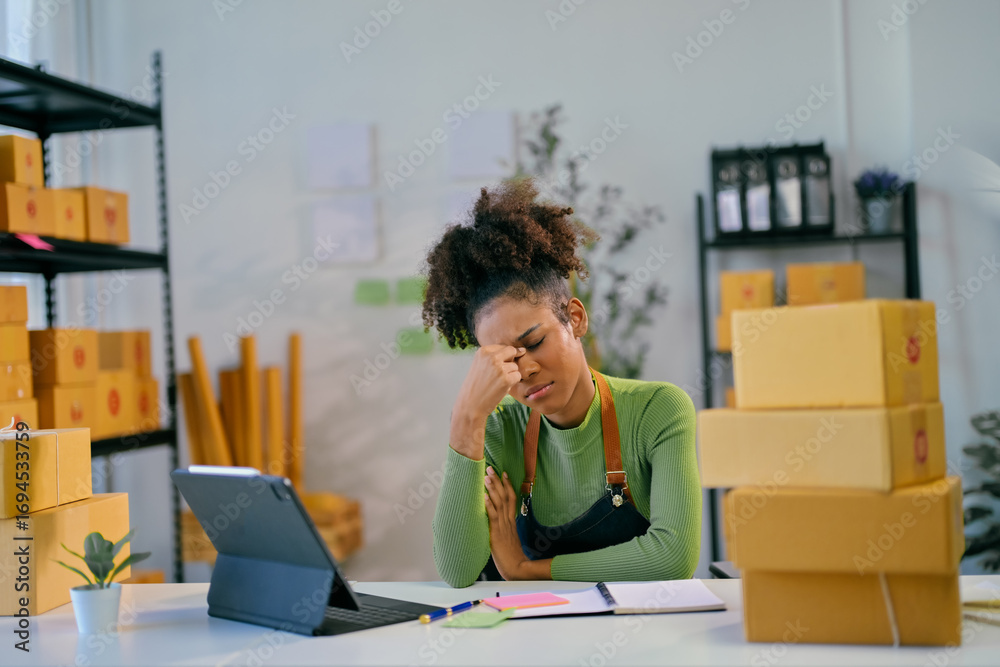 Stressed african american woman suffering from headache while working at her storehouse