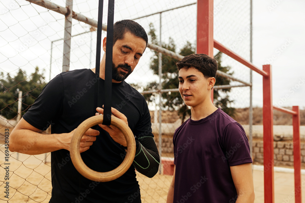 Smiling man and teenage boy exercising with gymnastic rings at outdoor fitness park