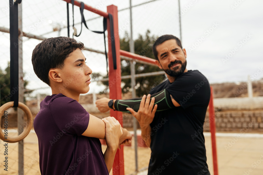 Teenage boy and adult man stretching arms before workout at outdoor fitness park