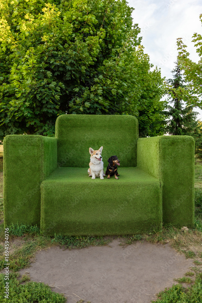 Corgi and Dachshund Dogs Sitting in Green Grass Maze Garden