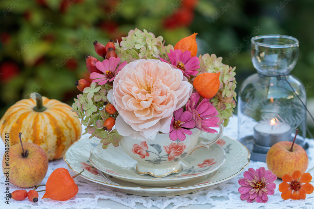 Blumen-Arrangement mit einer Rose, Zinnien, Hortensienblüten und Physalis in einer Porzellantasse