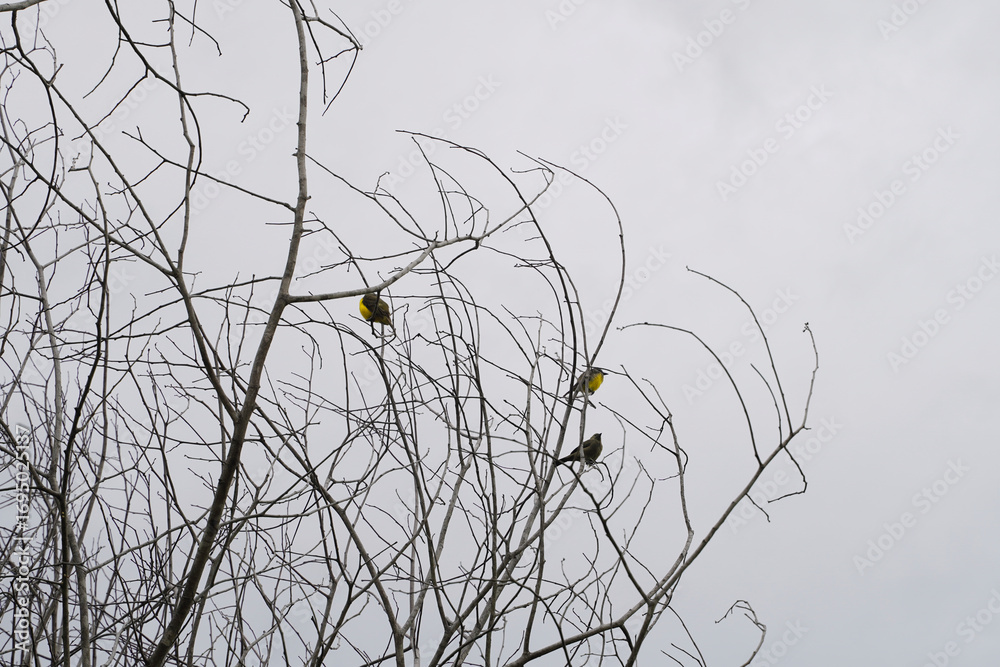 Male and female Narcissus Flycatcher on a dead tree in the forest with dry branches in the forest of Costa Rica, bird with breast.