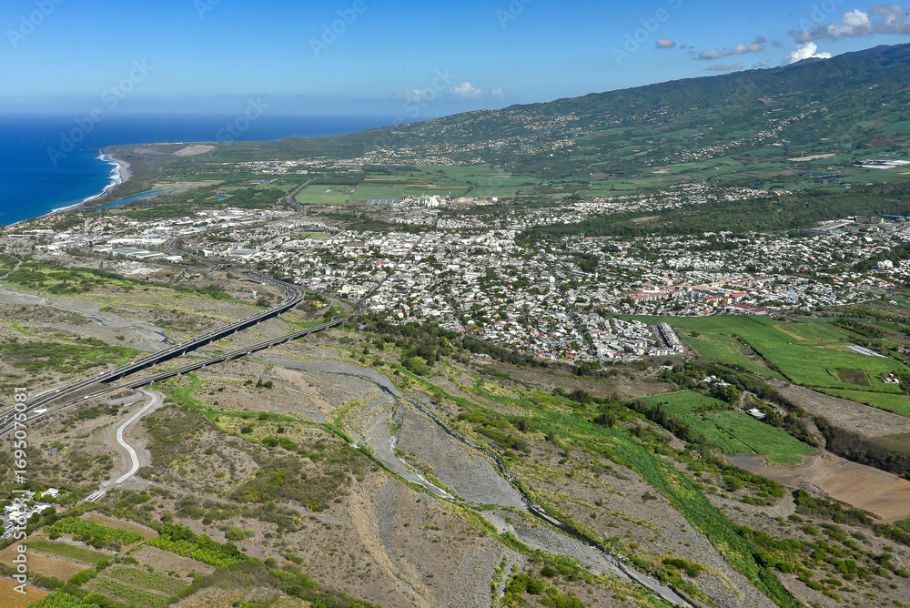 Vue aérienne de l'Ile de la Réunion. Aerial view of Reunion Island. La ville de Saint Louis au bord de l'Océan Indien, avec, au premier plan, la vallée de la Rivière Saint-Etienne.