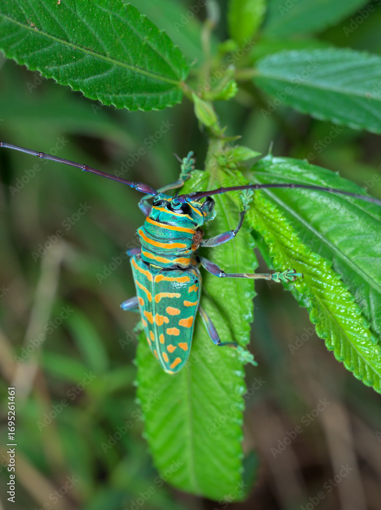 Jewel longhorn beetle (Sternotomis bohemani) on grass, Kwale county, coastal Kenya.