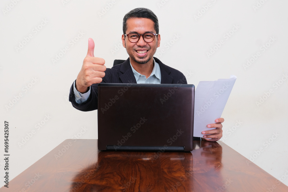 A company manager on his working desk smiling and give thumb up at the camera