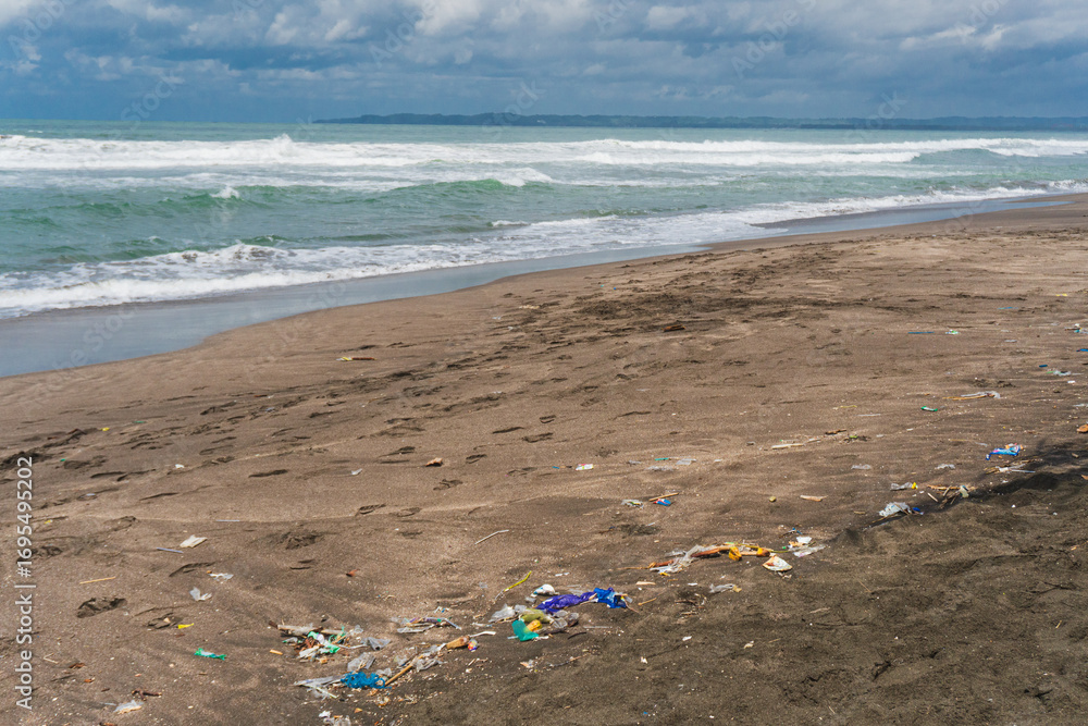 Trash scattered on the beach sand after being washed up by the waves. The concept of a polluted marine and coastal environment.
