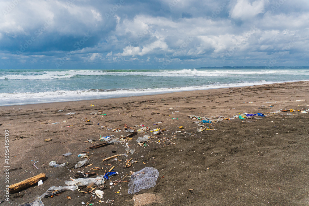Trash scattered on the beach sand after being washed up by the waves. The concept of a polluted marine and coastal environment.