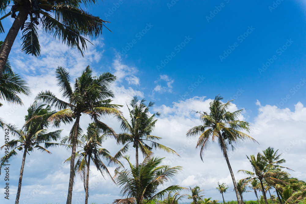 Coconut trees against a backdrop of bright, cloudy blue sky.
