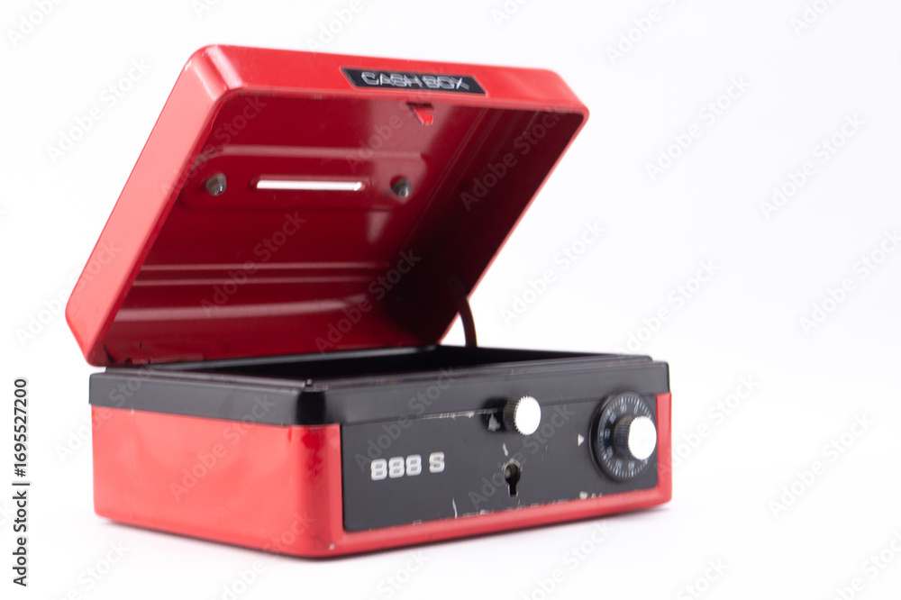 Open Red and Black Cash Box with Combination Lock on White Background.