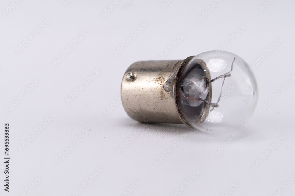Small Clear Light Bulb with Metal Base on White Background, Close-Up.