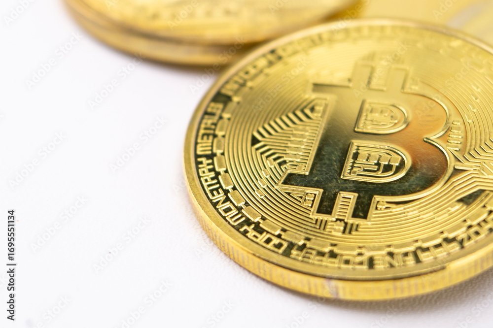 Golden Bitcoin Cryptocurrency Coin Close-Up on White Background, Digital Currency, Investment, Finance.
