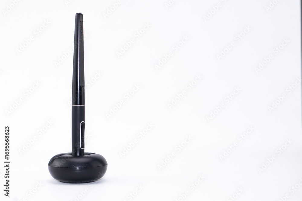 Black Stylus Pen in Holder on White Background, Close-up Studio Shot.