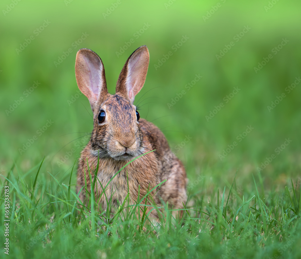 Cautious looking Cottontail bunny rabbit sitting in the grass in summer garden. Natural green background with copy space.