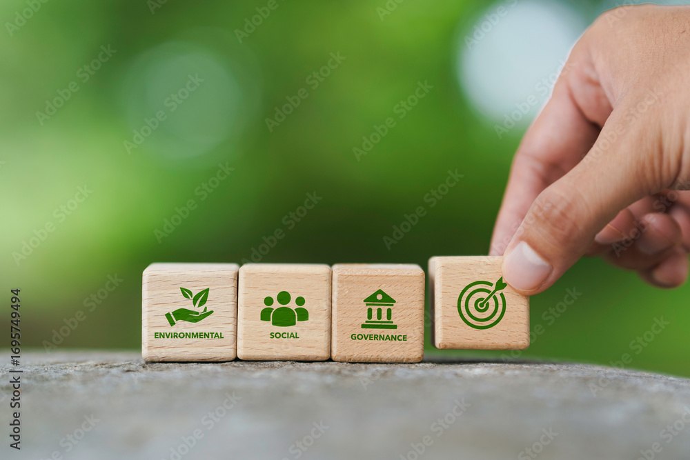 ESG target Environmental, Social, and Governance, representing sustainable business strategy and corporate responsibility, iso environmental. Hand placing a wooden block with ESG icon.