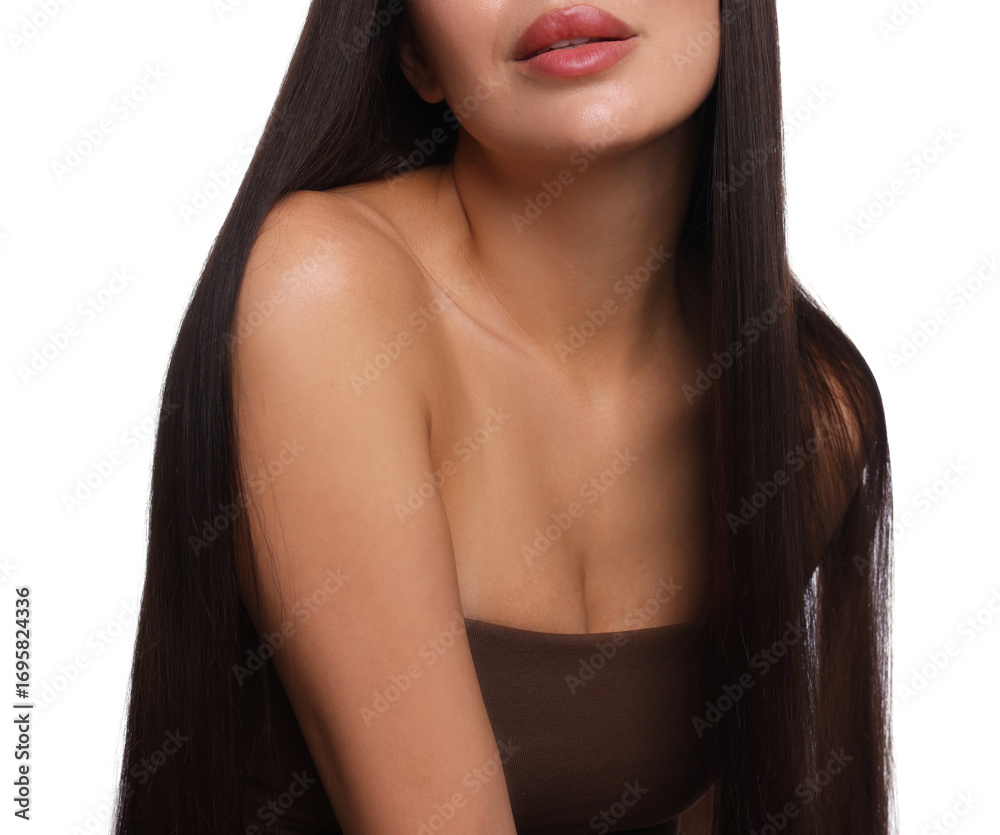 Woman with beautiful smooth hair after lamination procedure on white background, closeup