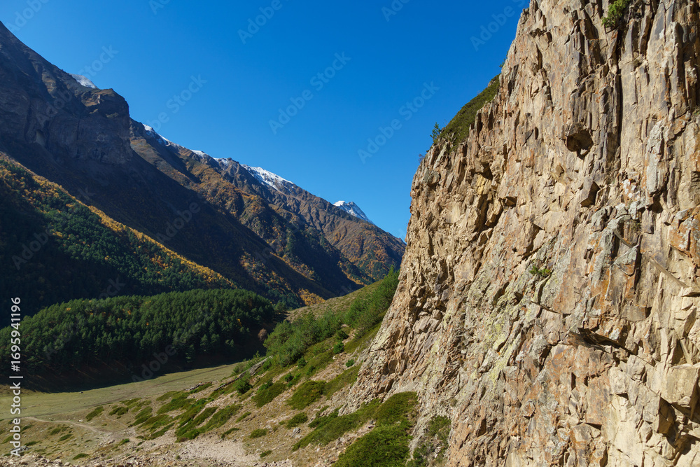 Majestic mountains tower over lush valley with dense forests and rolling hills, under clear blue sky, showcasing nature's grandeur and tranquility. Kabardino-Balkaria, Chegemsky district