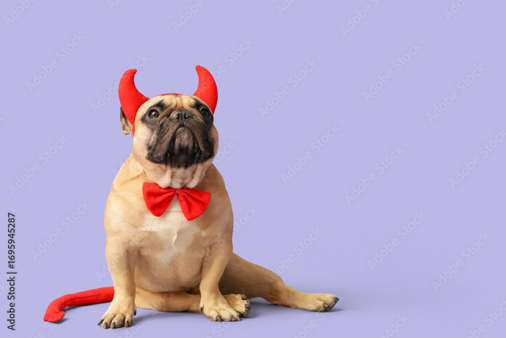 Cute French bulldog in Halloween devil horns sitting on purple background