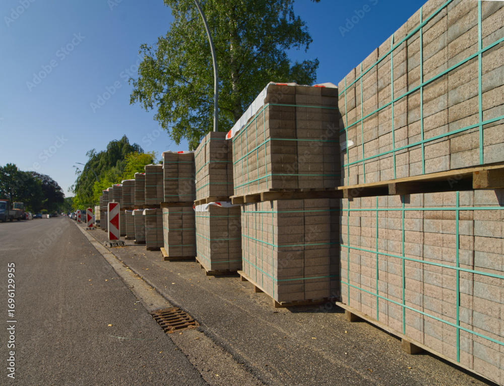 diverse Paletten mit Pflastersteinen