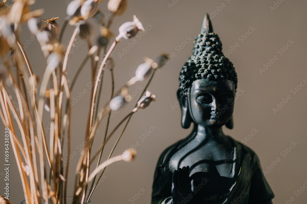Spirituality and zen still life with Buddha figurine and dried flowers