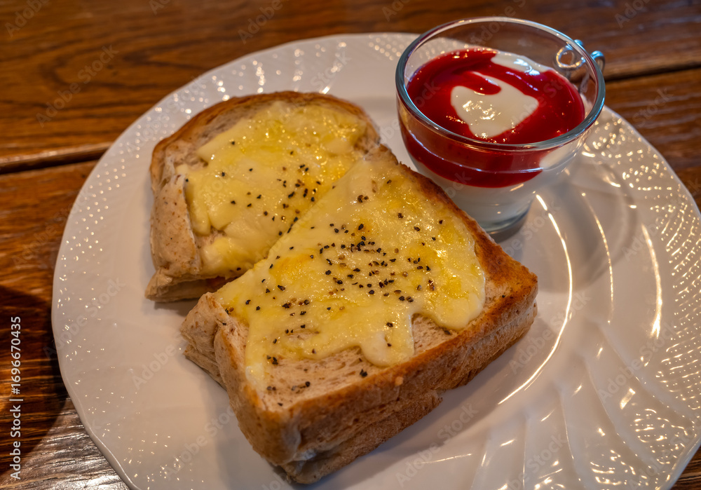 Home made butter and cheese top on toast with strawberry jam for breakfast on white ceramic dish