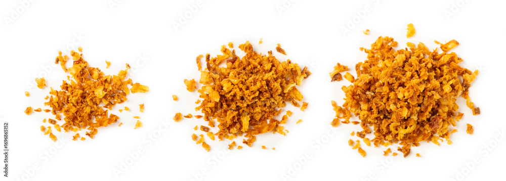 Crispy fried onion isolated on white background. Roasted Onions. Seasoning for dishes. Spices. Salad dressing. Space for text. Copy space