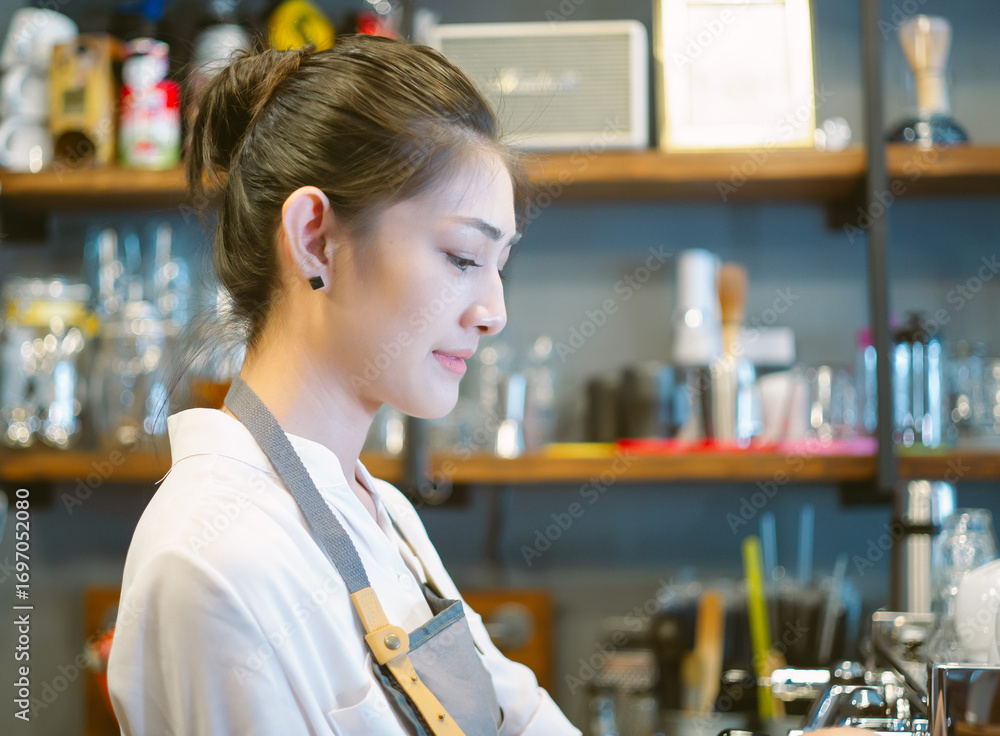 A young female barista wearing a white shirt and apron smiles softly while preparing coffee behind the counter in a modern café, surrounded by coffee equipment, glasses, and warm ambient décor.