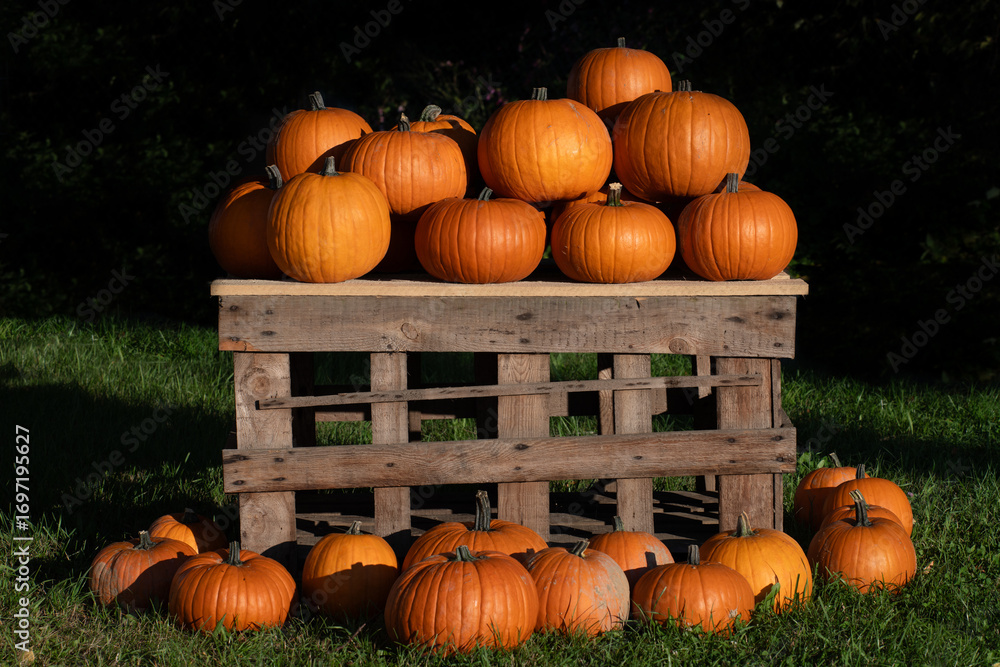 Many orange pumpkins are displayed on pallets for sale. The pallets are placed on a lawn in front of a dark background of bushes.