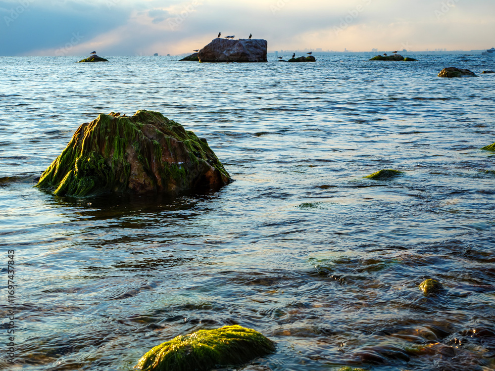 A moss covered rock stands alone in the calm blue sea under a soft sky a simple and serene minimalist landscape that evokes a sense of peace and solitude