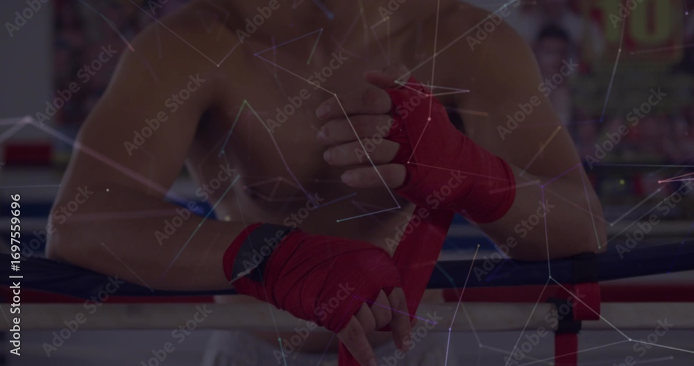 Mid adult boxer wrapping red hand wraps in boxing gym ring with white trunks and posters