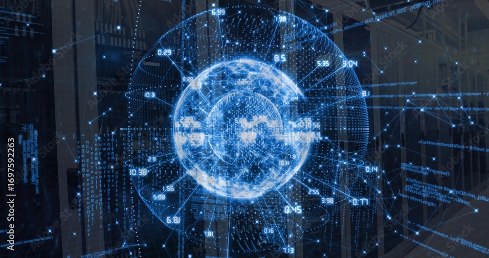 Floating blue wireframe globe showing numeric data labels in data center, with server racks