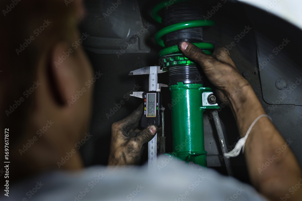 Auto mechanic is using a digital vernier caliper to measure the distance of a car coilover kits.