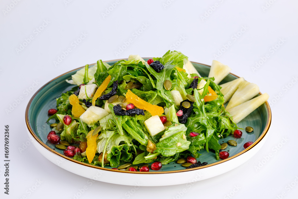 Plate of Fresh Vegetable Salad with Pomegranate Seeds and Cheese Cubes
