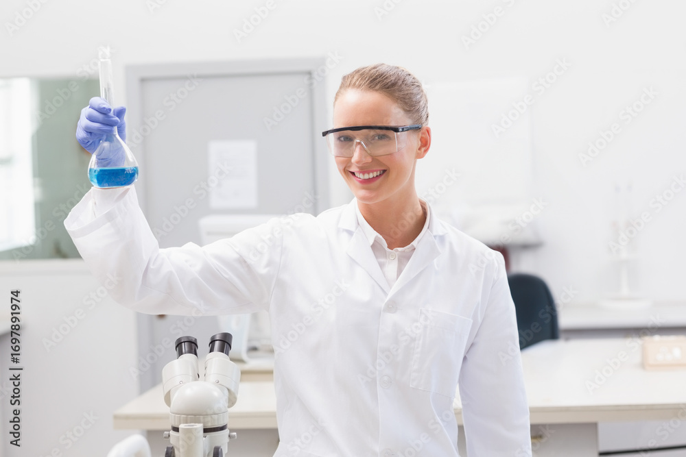 Woman scientist holding Erlenmeyer flask with blue solution in laboratory, with microscope