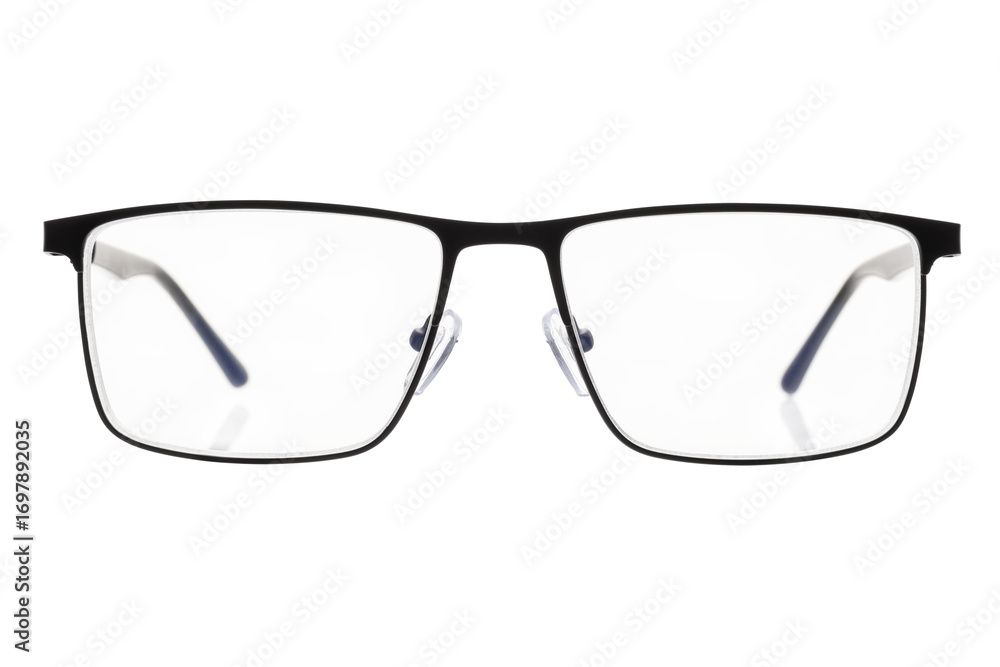 Classic reading glasses in a thin black frame, isolated on a white background, no brand, front view.