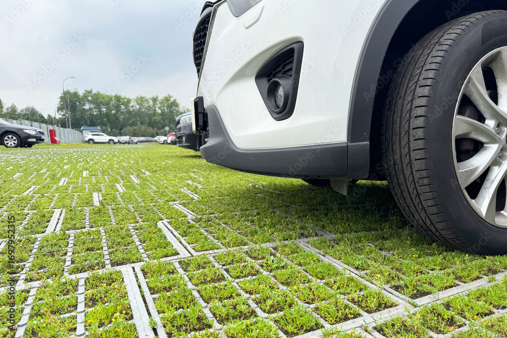 Eco-friendly car parking in urban setting, featuring gray paving stones interspersed with patches of green grass