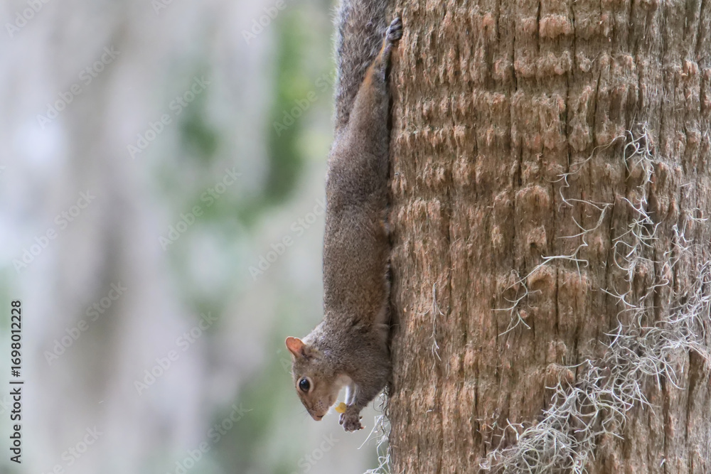 Close-up photo of an Eastern Gray Squirrel climbing down a tree while holding a nut in Savannah, Georgia, USA