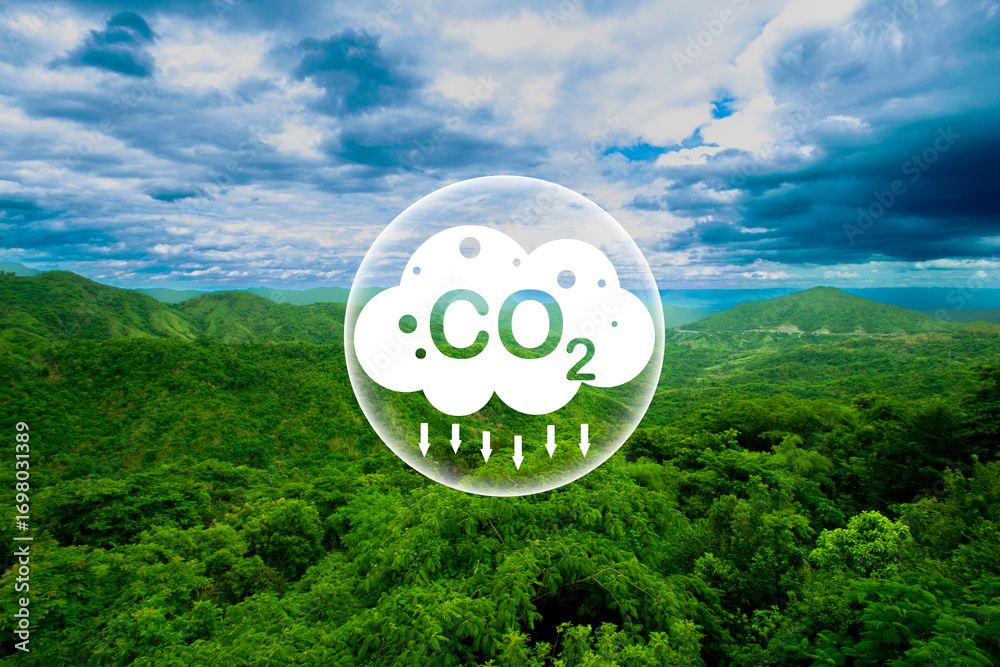 Carbon fixation fights nature. Arrows pointing down indicates carbon reduction.Carbon credit market and net zero exchange trading. carbon footprint to limit global warming and climate change.