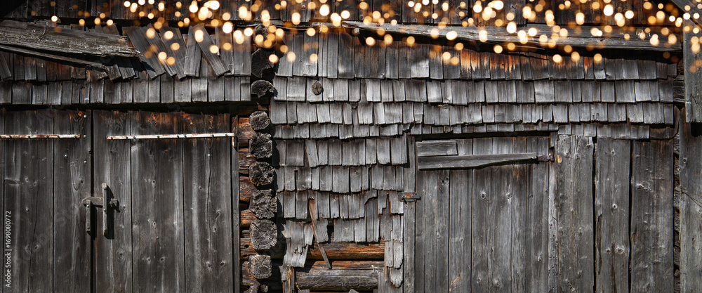 Weathered gray wood texture with golden bokeh lights for a christmas background and decoration with space for text.