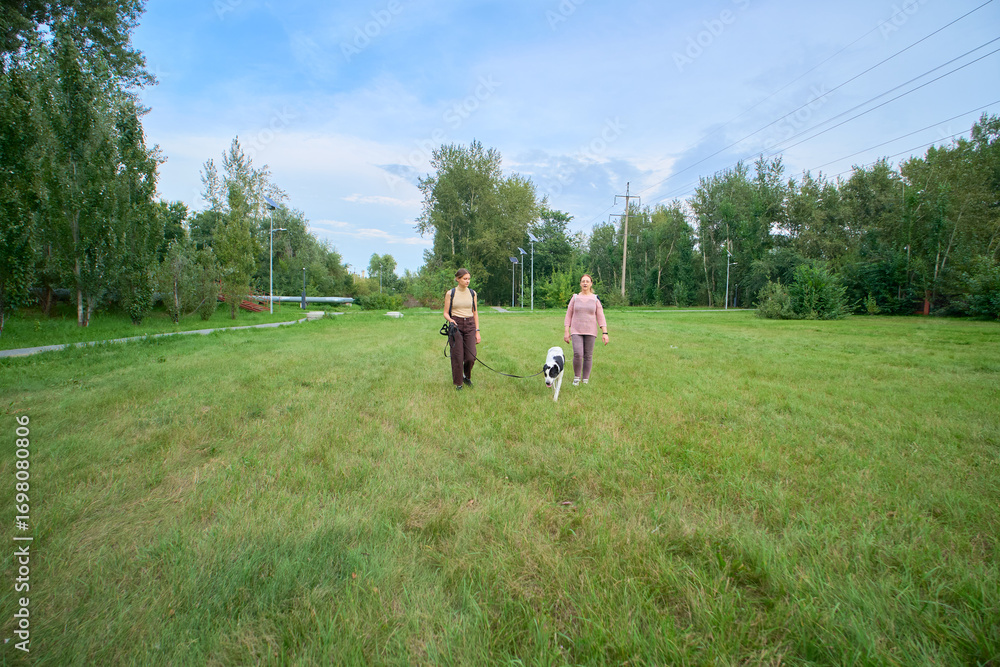 Two individuals leisurely stroll through a vibrant park while their dog explores the grassy area nearby